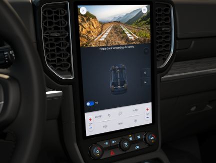 Màn hình cảm ứng quan sát địa hình trên Everest giúp cho người lái có thể xem đồng thời camera trước, lớp đồ họa, hiển thị độ nghiêng và dốc của xe và dễ dàng kích hoạt các tính năng như khóa vi sai.